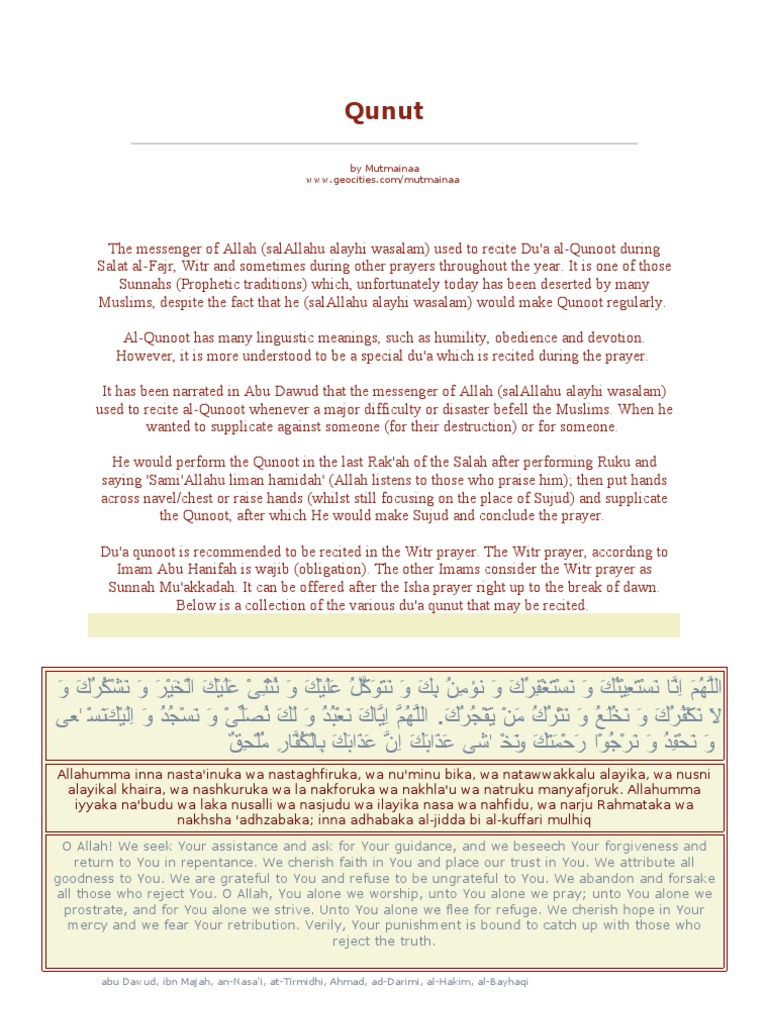 Dua qunoot in english transliteration:. Also the reciter gets enough funds to repay loans. Du'aa for protection against natural disaster, plague and war. If the qunoot is recited in the maghrib or eshaa salaah, it should be recited after the ruku' of the last rakaa'at. Qunoot will be recited in the second rakaa'at of the fardh of fajr, immediately after ruku' (in quama).